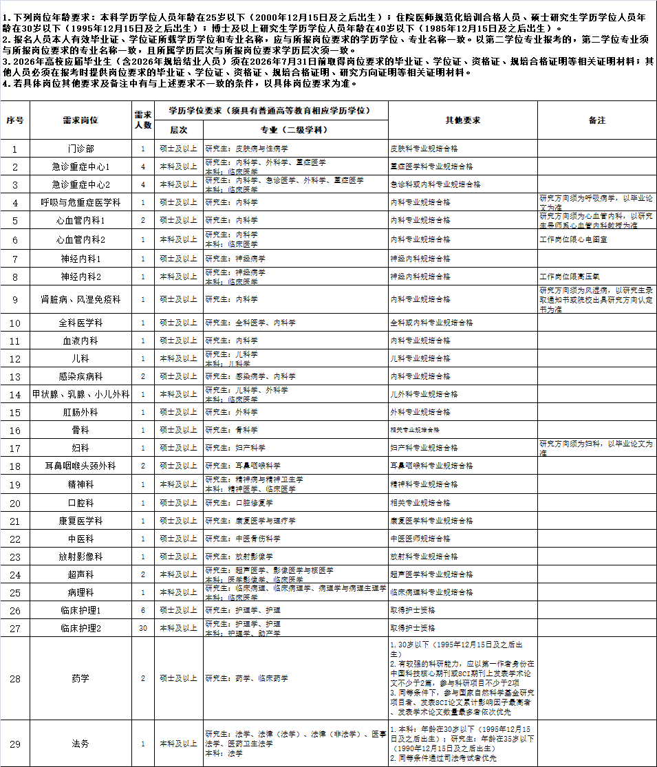 ①满足岗位要求的应届毕业生暂无法提供该阶段毕业证、学位证,须提供近期在学信网查询的可扫码验证的《学籍在线验证报告》(有效期限设置为6个月或更长);满足岗位要求的规培未结业人员暂无法提供规培结业证,须提供规培医院出具的含规培人员基本信息、规培专业和规培起止时间在内的规培证明(加盖公章);满足岗位要求的应届毕业生若暂无法提供护士资格证书、已发表论文资料、参与科研项目证明,可按岗位要求在2026年7月31日前提供,但已发表论文资料和参与科研项目证明须先提供现阶段相关佐证材料及情况说明。